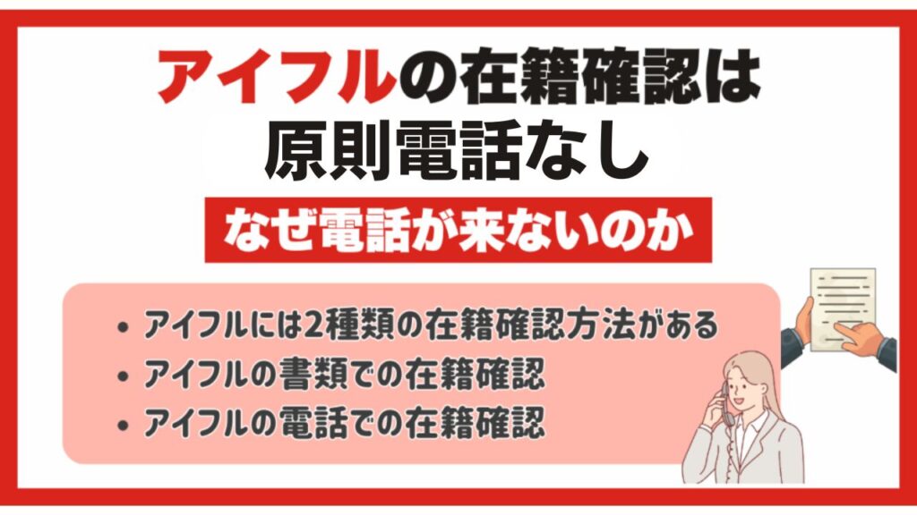 アイフルでは、在籍確認に「書類による確認」と「電話による確認」の2つの方法があります。基本的には書類提出だけで完了することが多く、勤務先への電話連絡はほとんど行われません。