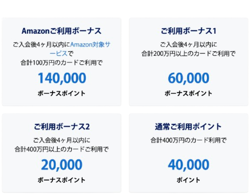 加えて、カード入会後4か月以内に200万円以上の利用で60,000ポイント、400万円以上でさらに20,000ポイント、そして通常利用分で40,000ポイントが貯まり、すべて合わせると26万ポイントに到達します。