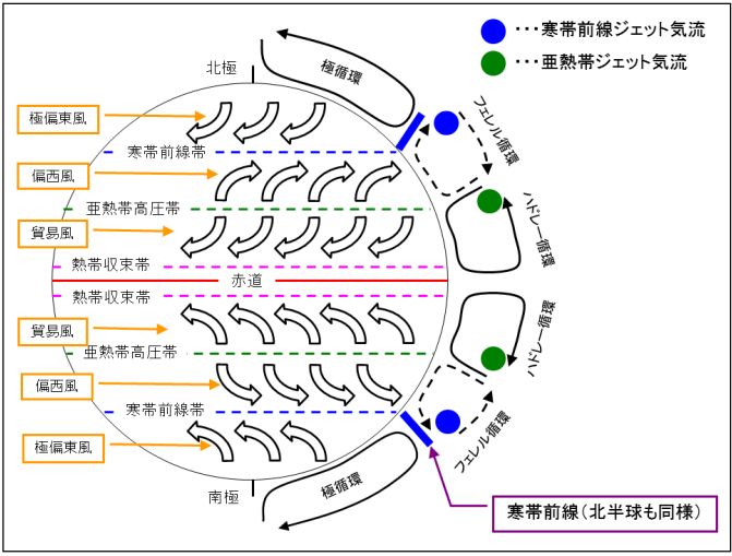【大気大循環の概念図(ジェット気流はいずれも西から東へ流れている)】