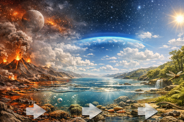 原始の地球を覆っていた過酷なガスが、どのようにして私たちが呼吸できる空気へと変わったのか、その変遷を三つの段階に分けて見ていきます。