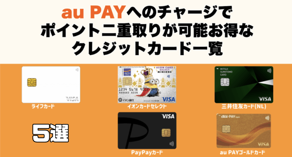 ポイント二重取りを狙うなら、au PAYにチャージができて、かつチャージ時にポイントが付くクレジットカードを選ぶことが大事です。