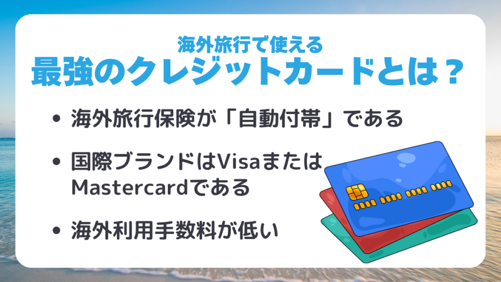 外せないのは「海外旅行保険」「世界シェア率が高い国際ブランド」「空港・旅行先でのサポート」などの記事前半で紹介した要素です。