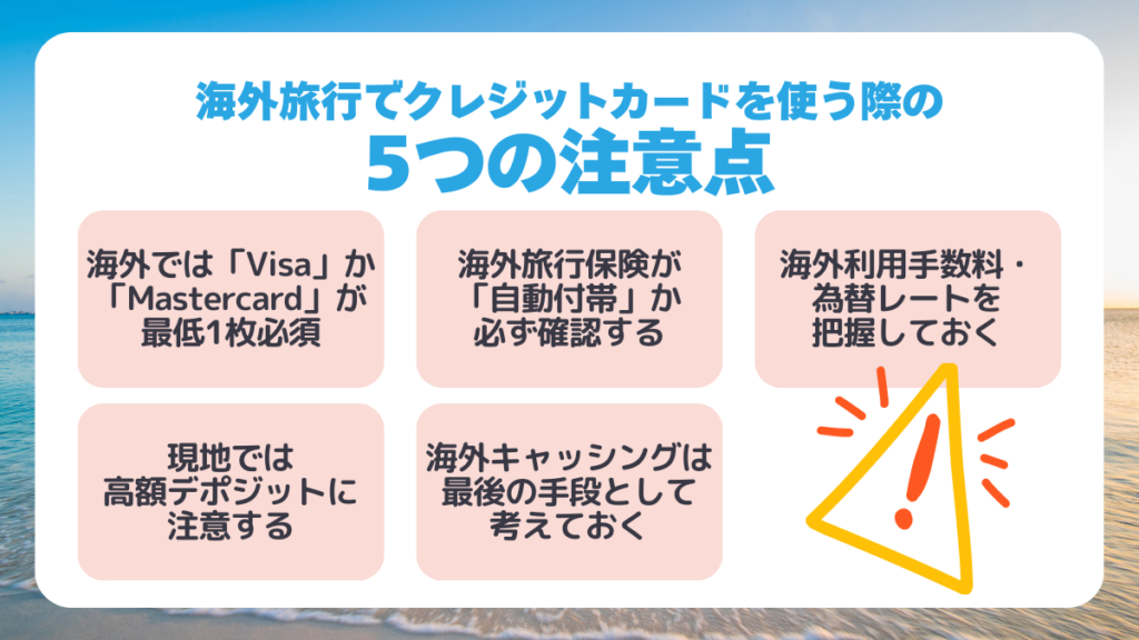 海外旅行でクレジットカードを使う際には以下の点に注意する必要があります。