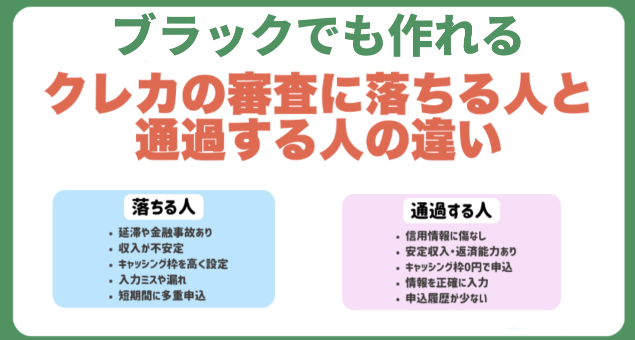 「ブラックでも作れる」と言っても、クレジットカードの審査には明確な基準があり、その通過・不通過にははっきりとした違いがあります。