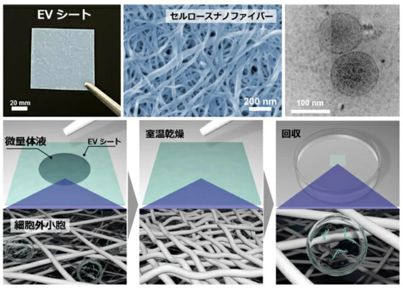 東京工業大学の研究グループは、木材由来のセルロースナノファイバーを用いて、EV(エクソソーム)を捕捉するナノ細孔構造を持つ「EVシート」を開発しました。CNFの高比表面積と吸水性により、極めて微量な体液からエクソソームを回収・保存する技術として注目されています。
