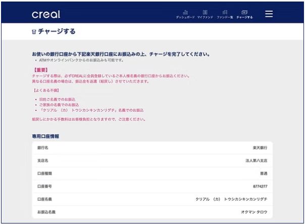 入金するにはCREAL(クリアル)にログインしたのち、メニューから「入金する」をタップします。その後、振込先が表示されるので、間違いが無いか確認しましょう。