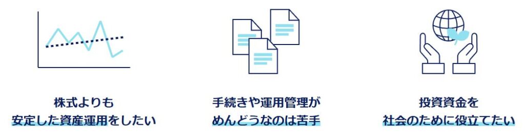 一般的な不動産物件だけでなく、太陽光や保育園などにも投資できます。