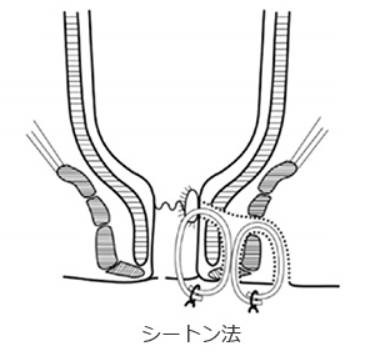 - シートン法:瘻孔に治療用ゴム糸を通し、ゴムの収縮する力を利用してゆっくり取り除く方法