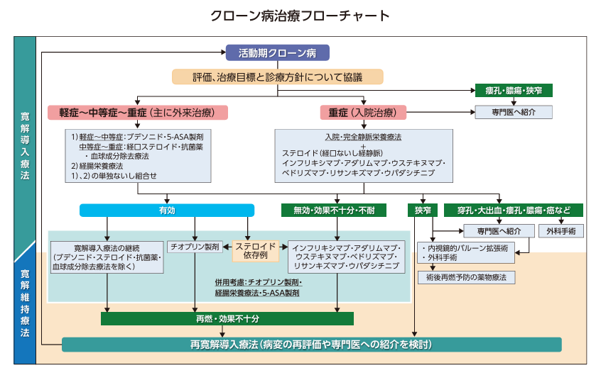 | 重症期 | 分子標的治療薬 | インフリキシマブやアダリムマブなど。入院患者には完全静脈栄養療法を用いることも多い。 |