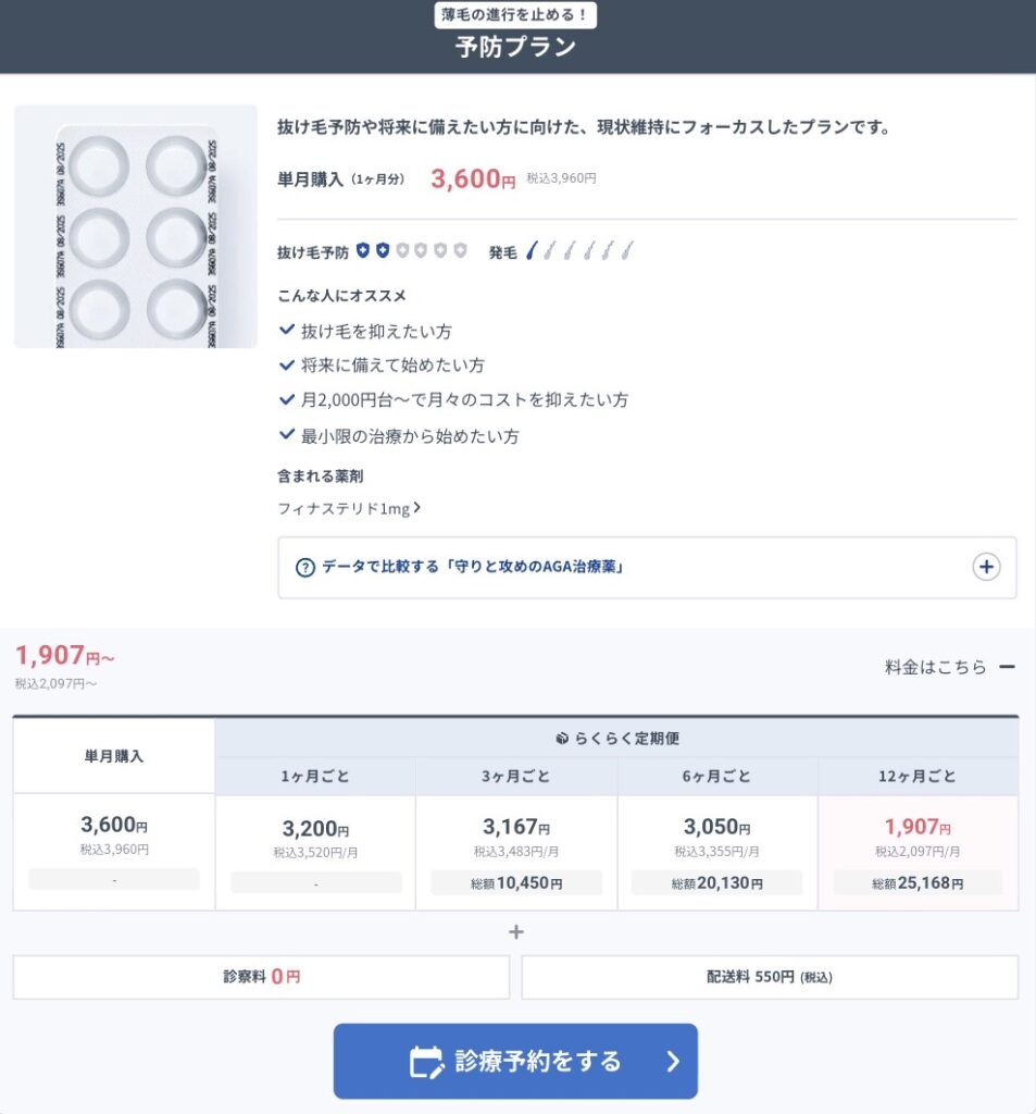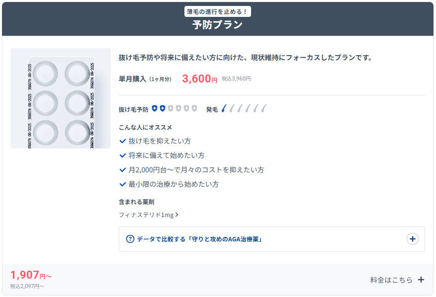 | 予防プラン | 1種類 ・フィナステリド (単月、定期便1・3・6・12ヶ月ごと) |