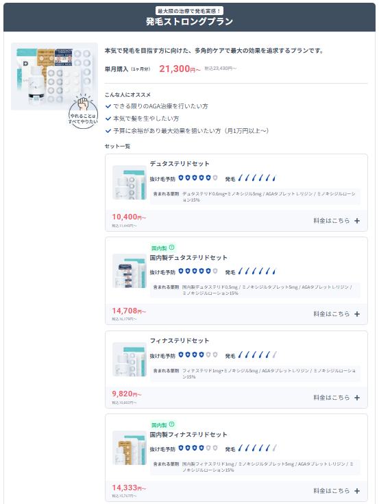 | 発毛ストロングプラン | 4種類 ・フィナステリドセット (単月、定期便1・3・12ヶ月ごと) ・国内製フィナステリドセット (単月、定期便1・3・6・12ヶ月ごと) ・デュスタリドセット (単月、定期便1・3・6・12ヶ月ごと) ・国内製デュスタリドセット (単月、定期便1・3・6・12ヶ月ごと) |