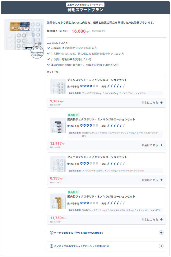 | 発毛スマートプラン | 4種類 ・フィナステリドセット (単月、定期便1・3・12ヶ月ごと) ・国内製フィナステリドセット (単月、定期便1・3・6・12ヶ月ごと) ・国内製デュスタリドセット (単月、定期便1・3・6・12ヶ月ごと) |