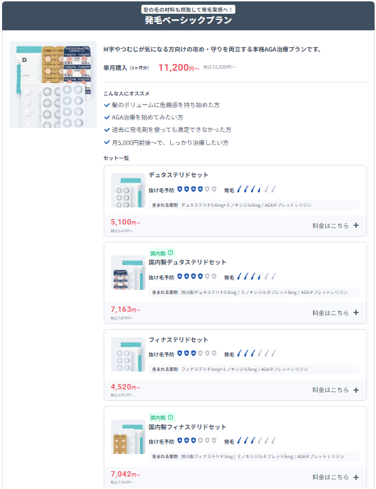 | 発毛ベーシックプラン | 4種類 ・フィナステリドセット (単月、定期便1・3・12ヶ月ごと) ・国内製フィナステリドセット (単月、定期便1・3・6・12ヶ月ごと) ・デュスタリドセット (単月、定期便1・3・6・12ヶ月ごと) ・国内製デュスタリドセット (単月、定期便1・3・6・12ヶ月ごと) |