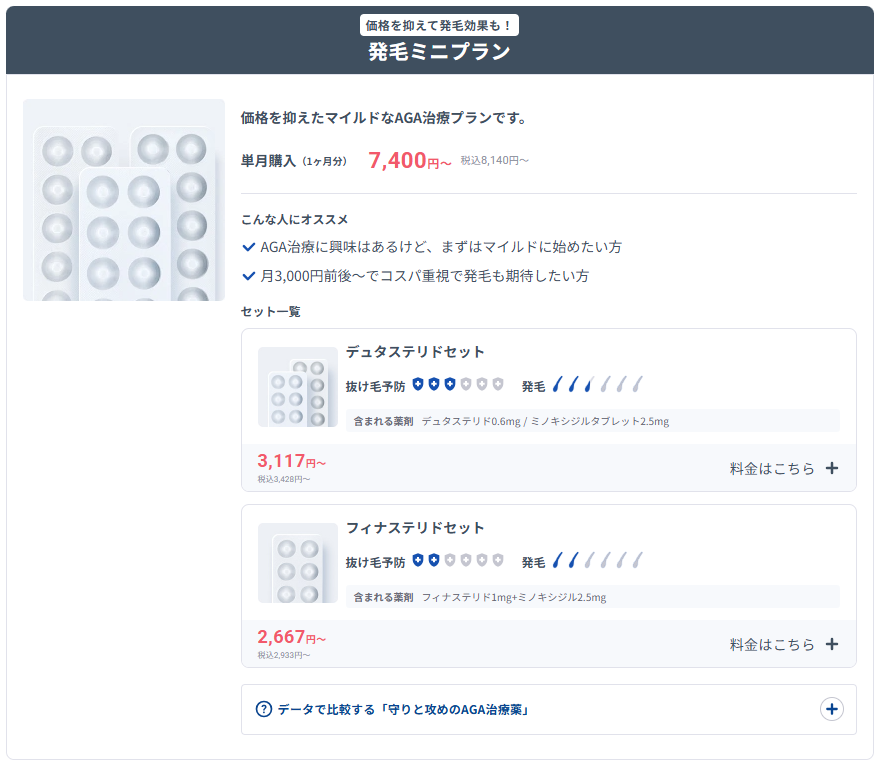 | 発毛ミニプラン | 2種類 ・デュタステリドセット (単月、定期便1・3・12ヶ月ごと) ・フィナステリドセット (単月、定期便1・3・12ヶ月ごと) |