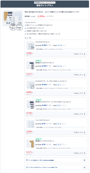 | 発毛ライトプラン ※こちらのページからの予約で限定価格! | 5種類 ・フィナステリドセット (単月、定期便1・3・12ヶ月ごと) ・国内製フィナステリドセット (単月、定期便1・3・6・12ヶ月ごと) ・デュタステリドセット (単月、定期便1・3・6・12ヶ月ごと) ・国内製デュスタリドセット (単月、定期便1・3・6・12ヶ月ごと) ・デュタステリド・ミノキシジルローションセット (単月、定期便1・3・6・12ヶ月ごと) ・国内製デュタステリド・ミノキシジルローションセット (単月、定期便1・3・6・12ヶ月ごと) |