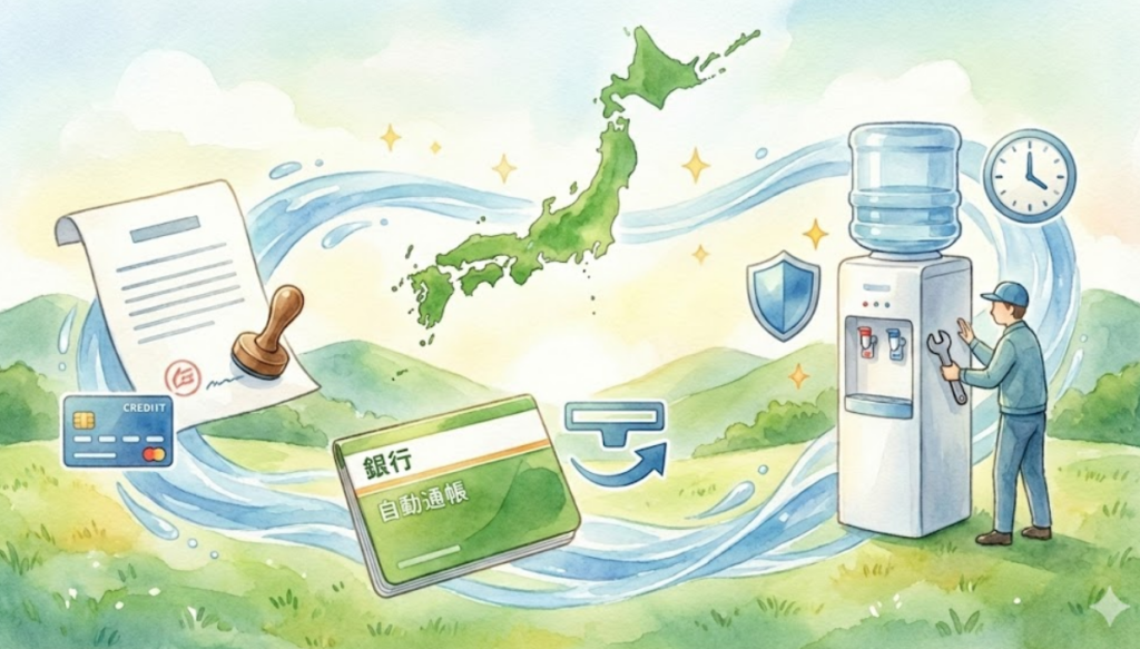 水は山梨県富士と兵庫県朝来と熊本県南阿蘇で採水した天然水から選択でき、どの採水地の天然水でも料金は一律です。