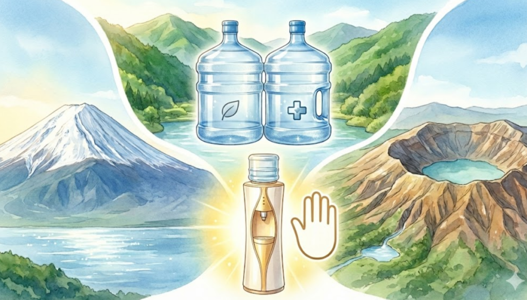 | 水の種類 | 天然水3種類(山梨県富士・兵庫県朝来・熊本県南阿蘇) | 天然水3種類(静岡県御殿場・京都府福知山・大分県日田) | RO水(純水) | 8種類(山梨県富士吉田・静岡県富士・長野県大町・岐阜県本巣・奈良県吉野・兵庫県朝来・島根県浜田・熊本県阿蘇) |
