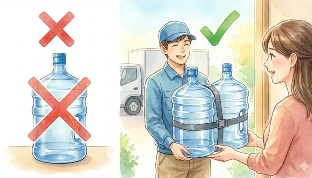 どこよりもウォーターの水は1本12Lですが、1本単位での配達は行っていません。2本1セット配達が基本です。