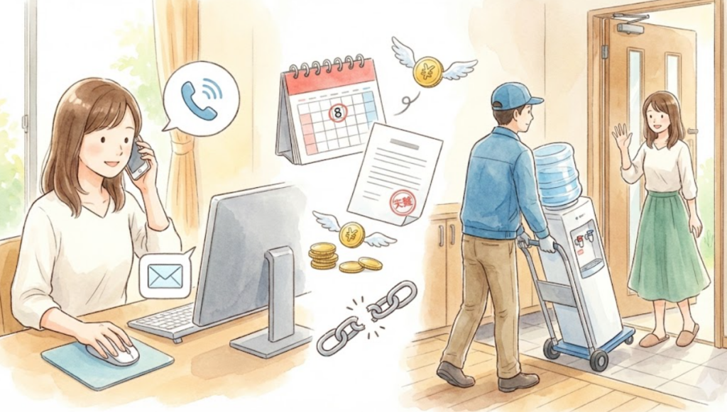 配送日や契約内容を変更した場合には、サポートセンターに電話またはメールをするか、どこよりもウォーター公式サイトのマイページからお手続きください。