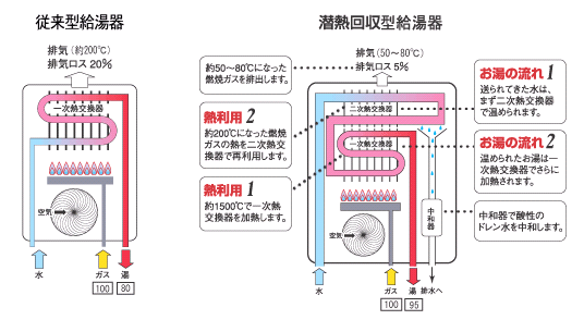 従来のガス給湯器ではそのまま排出していた200℃の高温ガスを再利用することにより、熱効率が、