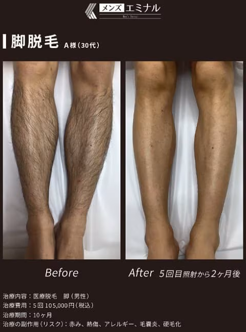 エミナルクリニックメンズのスネ脱毛では、施術前は濃く密集していたムダ毛が、回数を重ねるごとに徐々に薄くなっていく変化が確認できます。5回コース終了時には自己処理がほぼ不要になるレベルまで改善。