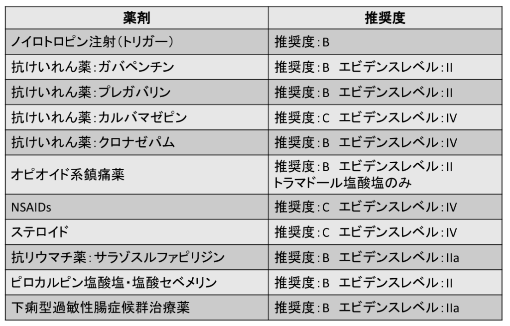 下の表はガイドラインに案としてあげられたものですが、誰にでも必ず効くというものはなく、症状が慢性化すると以前効果があったものでも、効き続けるとは限らず、試行錯誤の治療となります。