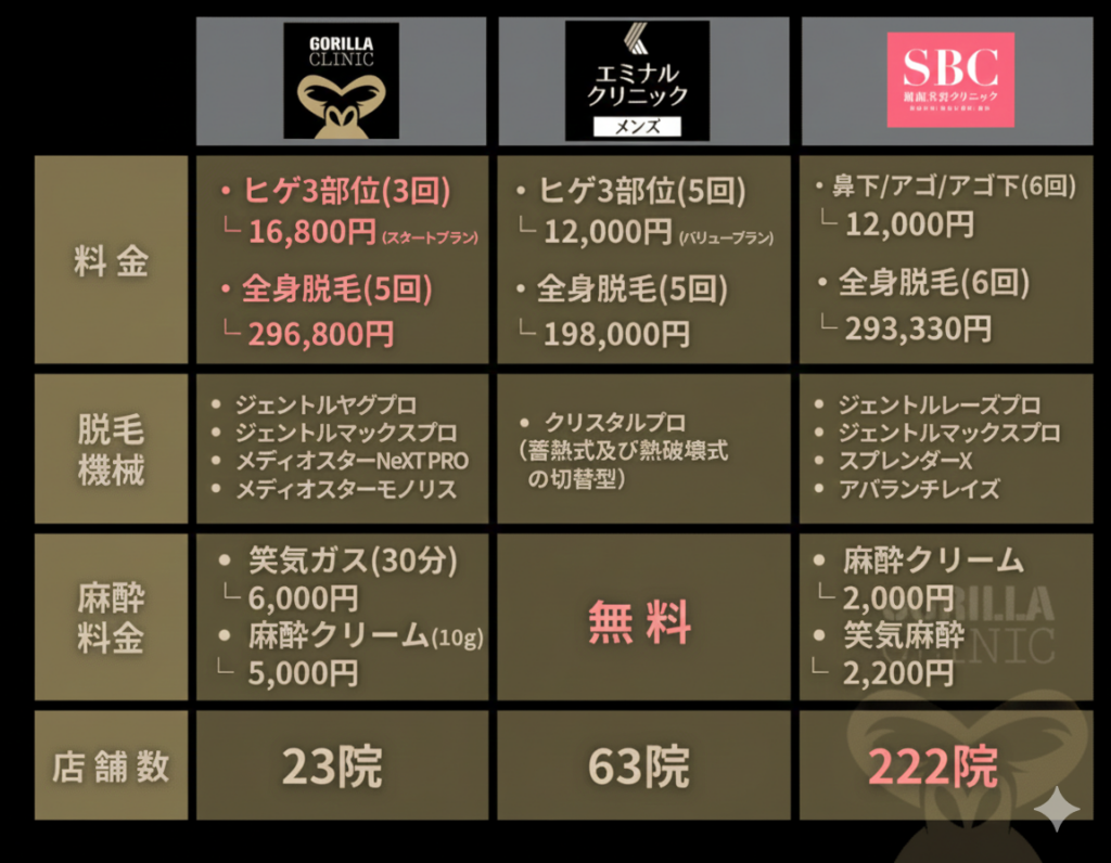 全国に23院を展開するメンズ専門の医療脱毛ゴリラクリニックは、累計420万人以上という高い実績を誇る業界大手で、脱毛以外にもAGAやダイエットといった多彩な施術を行っています。