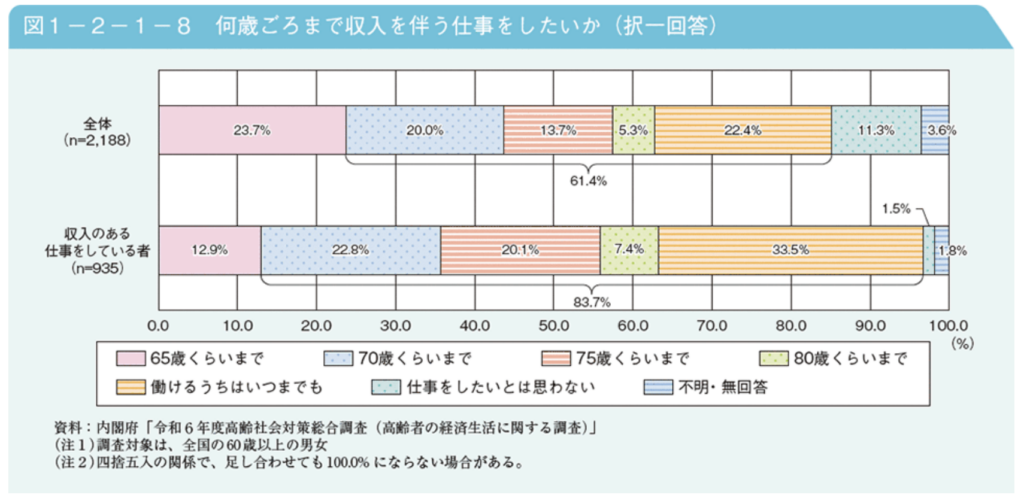 このように少子高齢化が進む中、どの企業も働き手の確保が将来的に深刻な課題となることが予想されます。経済産業省の調べでは70歳以降も働くことを希望している60歳以上の人は約8割ほどに達し、今後多くの企業はこの高齢者の労働力を活かしていくことが必須となります。