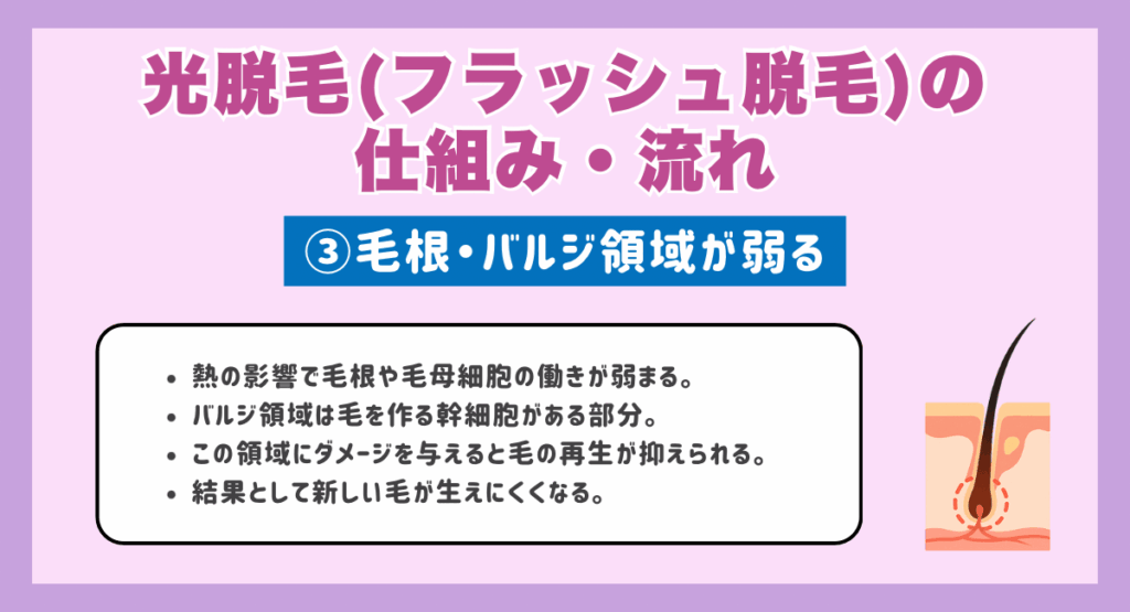 熱によるダメージで毛根や毛母細胞、バルジ領域の働きが弱まります。バルジ領域は毛の成長を促す幹細胞が集まる場所で、ここにダメージを与えることで新たな毛の生成が抑制されます。