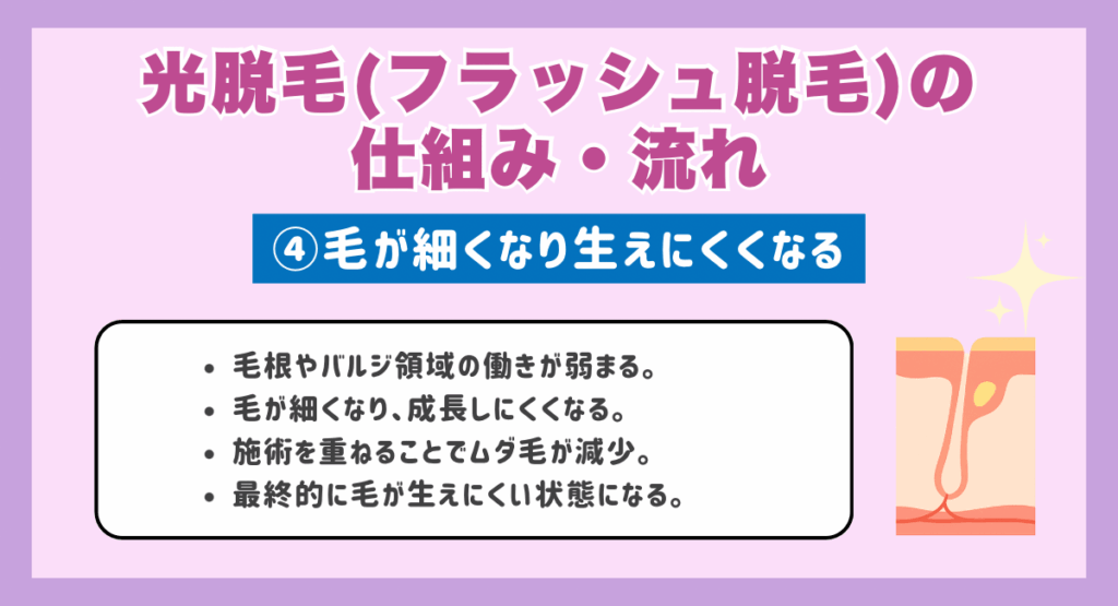 毛根やバルジ領域の機能が弱まることで、毛は徐々に細くなり、成長しにくくなります。施術を繰り返すことでムダ毛が目立たなくなり、最終的には生えにくい状態へと導びかれます。