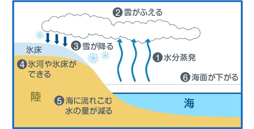 氷期の最も劇的な変化が世界規模での海面低下です。気温低下により陸上に巨大な氷床が発達すると、蒸発した海水が雪として降り積もり、氷として陸に固定されるため、海の水の総量が減少します。
