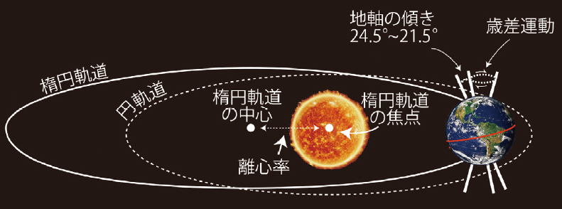【ミランコビッチ・サイクルの地球軌道要素(歳差運動、地軸の傾き、離心率)】