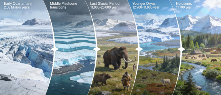 このように、氷期は天文学的な要因と地球内部のシステムが作用して生じ、私たちの文明が基礎を置く地形や環境を形成してきた重要な時代です。次の章では、氷期の特徴について見ていきましょう。*1)