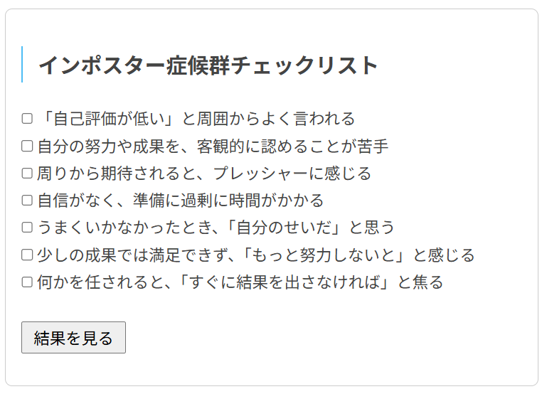 とはいえ、セルフチェックはあくまで目安です。インポスター症候群が疑われる人は、自己評価の低い特徴を持っています。正しい診断は医療機関や専門医から受けることをお勧めします。