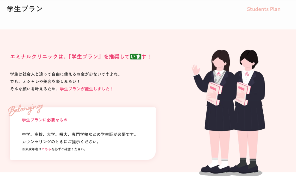 | ペア割 | エミナルクリニックに初来院&2名以上で同時カウンセリング&当日契約で割引 | |