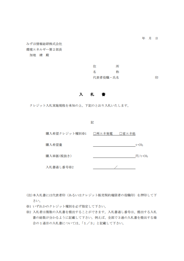 J-クレジット制度『第5回J-クレジットの入札販売について 2.9 申請書類の提出 入札書』