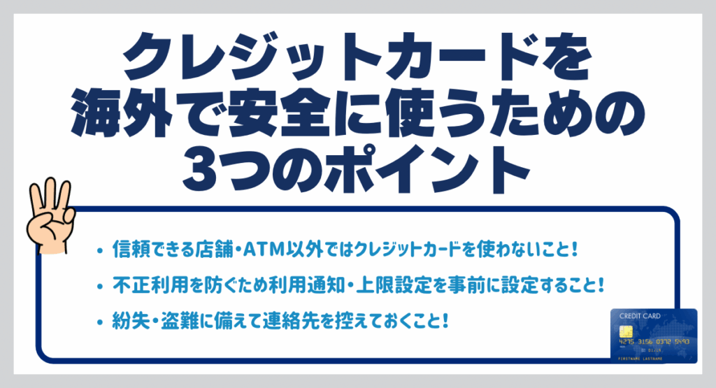 クレジットカードは海外旅行の必須アイテムではありますが、必須アイテムだからこそ安全に使う必要があります。