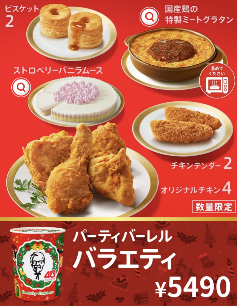 公式クリスマス特設ページでも、パーティバーレルやクリスマスパックといった限定商品が紹介されている一方で、通常のオリジナルチキンやサイドメニューの取り扱いについては特別な制限情報は掲載されていません。