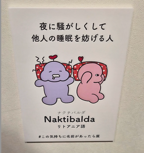 たとえば展示の一つに、「夜に騒がしく、他人の睡眠を妨げる人」という意味のことばがある。