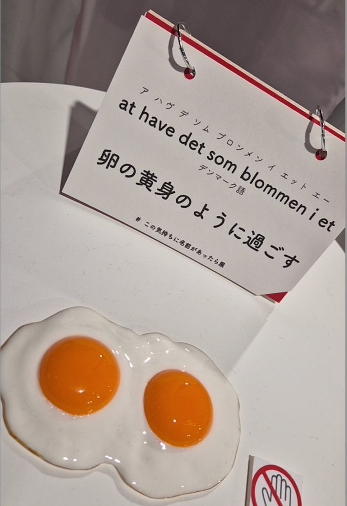 卵が並べられた展示では、「卵の黄身のように過ごす」という一文が添えられている。