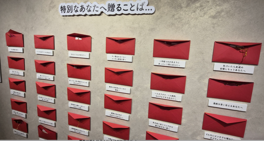 壁一面に封筒が貼られたゾーンでは、人の特徴や状態を表すフレーズが並ぶ。