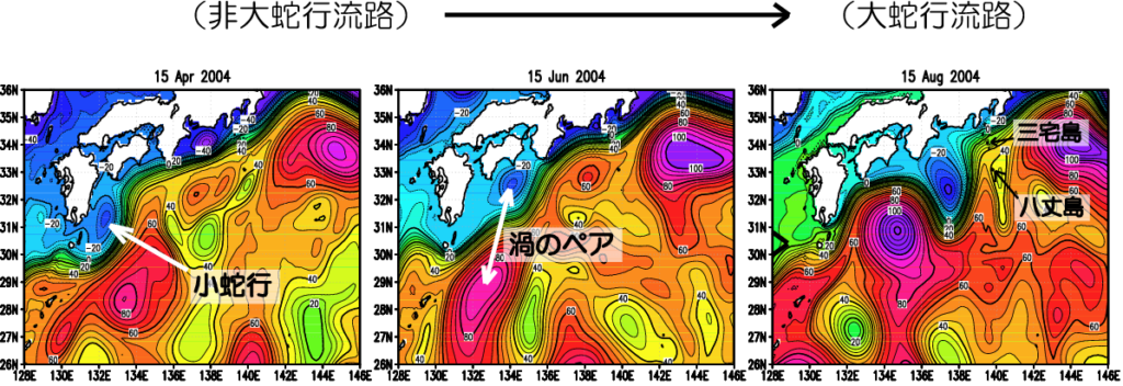 【2004年夏に生じた大蛇行の発生過程(4月から8月にかけての水位の分布)】