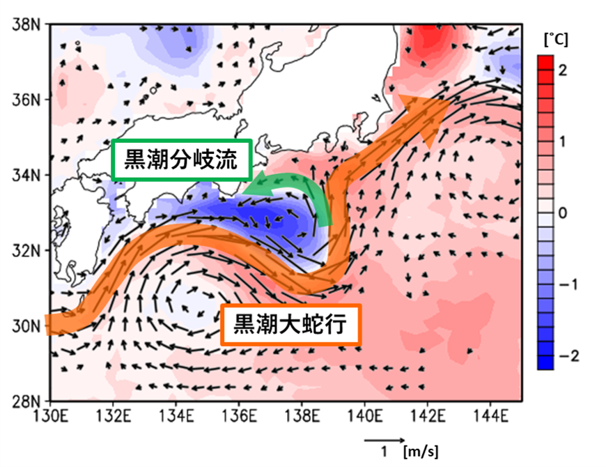 - 大蛇行流路:紀伊半島沖から東海沖で北緯32度より南まで大きく迂回する形態