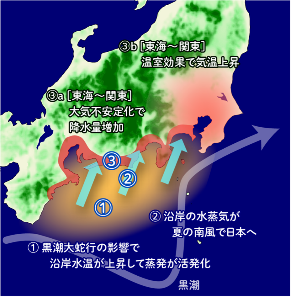 海面水温の変化は、上空の大気の状態を左右し、日本列島の気象現象に直接的な影響をもたらしました。東北大学の研究によれば、黒潮が大蛇行している期間、海から東海地方へ大量の水蒸気が供給されることで、気温が上昇し、降水量が増加することが明らかになっています。