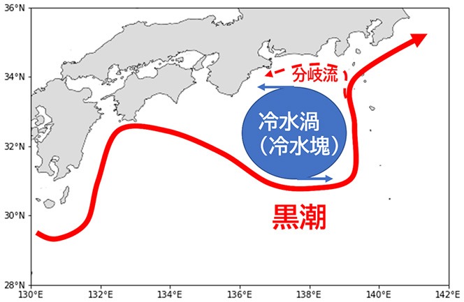 黒潮が大蛇行を描くと、本州沿岸と黒潮の間に反時計回りの巨大な冷水塊が発生します。半径200km程度に達するこの冷水塊は、海面付近から水深数千メートルまで循環が及び、魚の回遊ルートを変化させます。