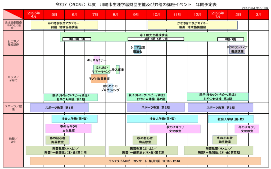 下の表は川崎市のものですが、夏休みを利用したキッズ向けや、年間を通したコンサートなど、実に幅広い生涯学習が展開されていることが分かります。