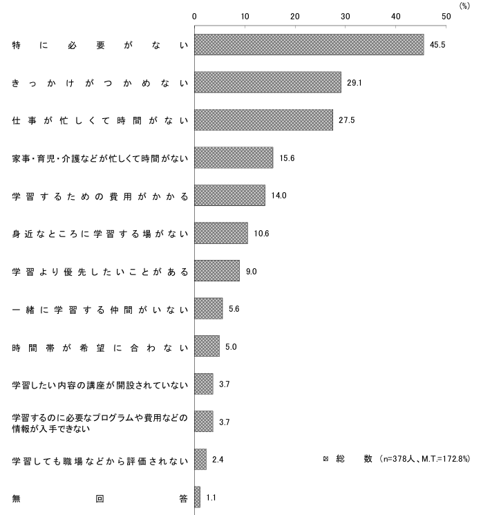 前述の調査結果で「学習していない」と答えた24.3%の理由を見てみましょう。「特に必要がない」が1位でした。平成30年度の同質問への答え第1位は、「仕事が忙しくて時間がない」でした。