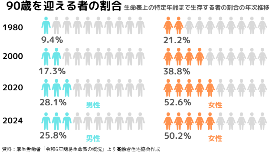 平均寿命ばかりではなく健康寿命も先進諸国のトップとなっており、「90歳を迎える者の割合」は、男性で25.8%女性は50.2%と報告されています。長い年月を心身共に豊かにすごせるかどうかはますます大切な問題となってきています。