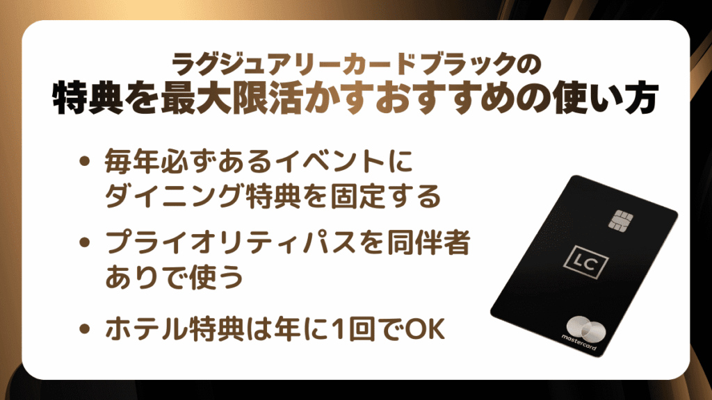 ラグジュアリーカードブラックは、特典を計画的に使うことで年会費以上の価値を引き出しやすいカードです。