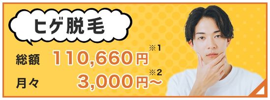 | ヒゲ脱毛料金 | ヒゲ全体プラン(8回):110,660円 | ヒゲ全体美容脱毛コース(6回):94,500円 | ヒゲ脱毛 全8カ所セット(10回):109,800円 |